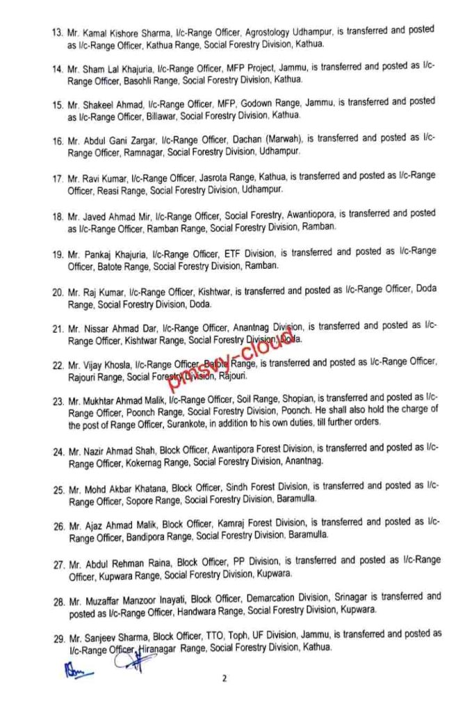 1. Mr. Kamal Kishore Sharma, I/c-Range Officer, Agrostology Udhampur, is transferred and posted as l/c-Range Officer, Kathua Range, Social Forestry Division, Kathua.