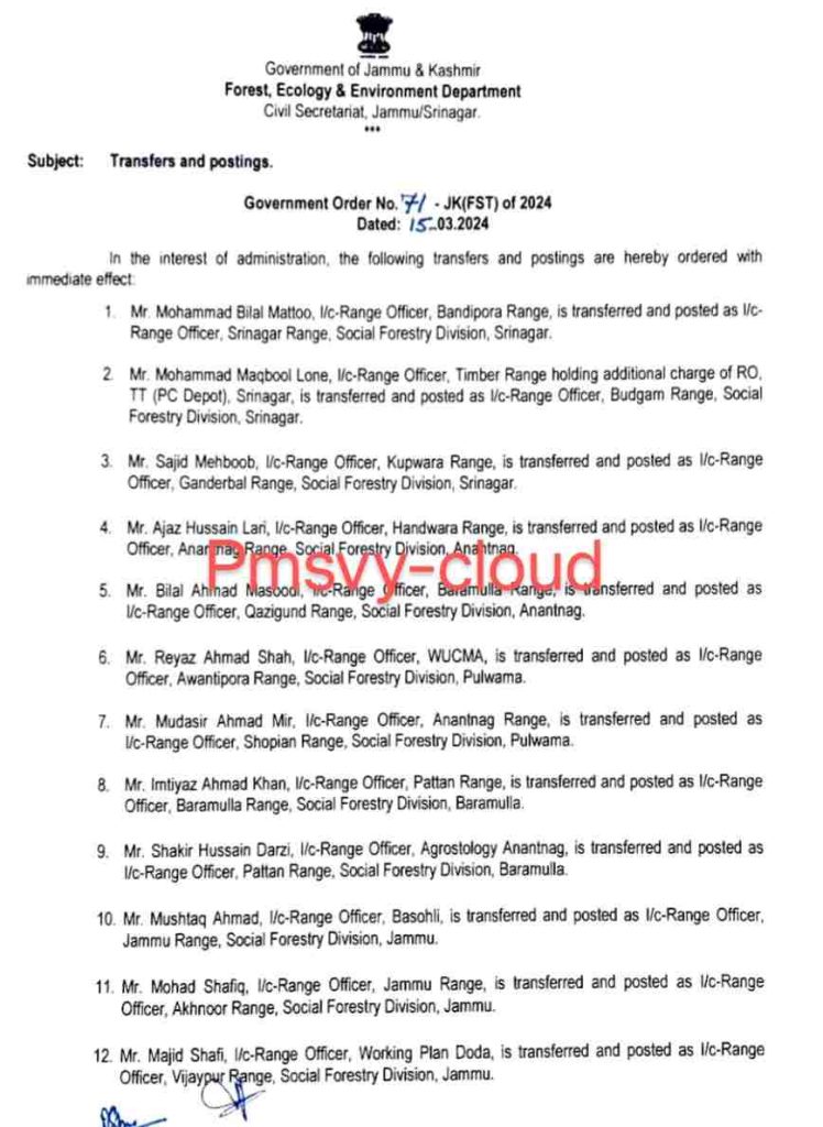 1. Mr. Mohammad Bilal Mattoo, I/c-Range Officer, Bandipora Range, is transferred and posted as l/c- Range Officer, Srinagar Range, Social Forestry Division, Srinagar.