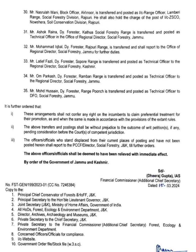 J&K Government Directs Transfers of 35 RO/Deputy Foresters