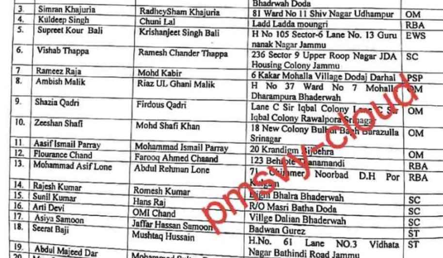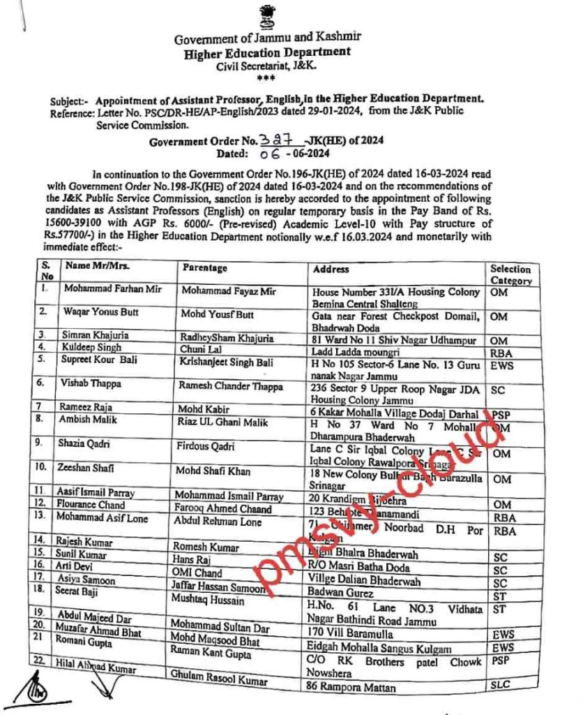 In continuation to the Government Order No.196-JK(HE) of 2024 dated 16-03-2024 read with Government Order No.198-JK(HE) of 2024 dated 16-03-2024 and on the recommendations of the J&K Public Service Commission, sanction is hereby accorded to the appointment of following candidates as Assistant Professors (English) on regular temporary basis in the Pay Band of Rs. 15600-39100 with AGP Rs. 6000/- (Pre-revised) Academic Level-10 with Pay structure of Rs.57700/-) in the Higher Education Department notionally w.e.f 16.03.2024 and monetarily with immediate effect:-