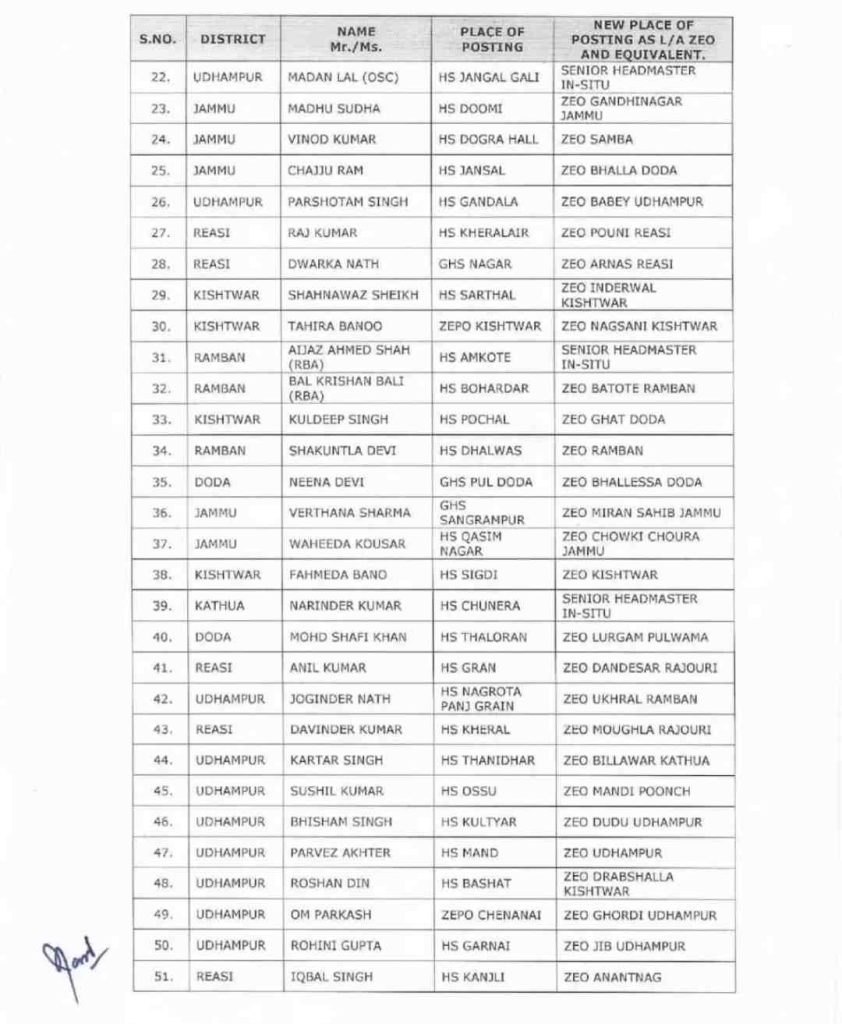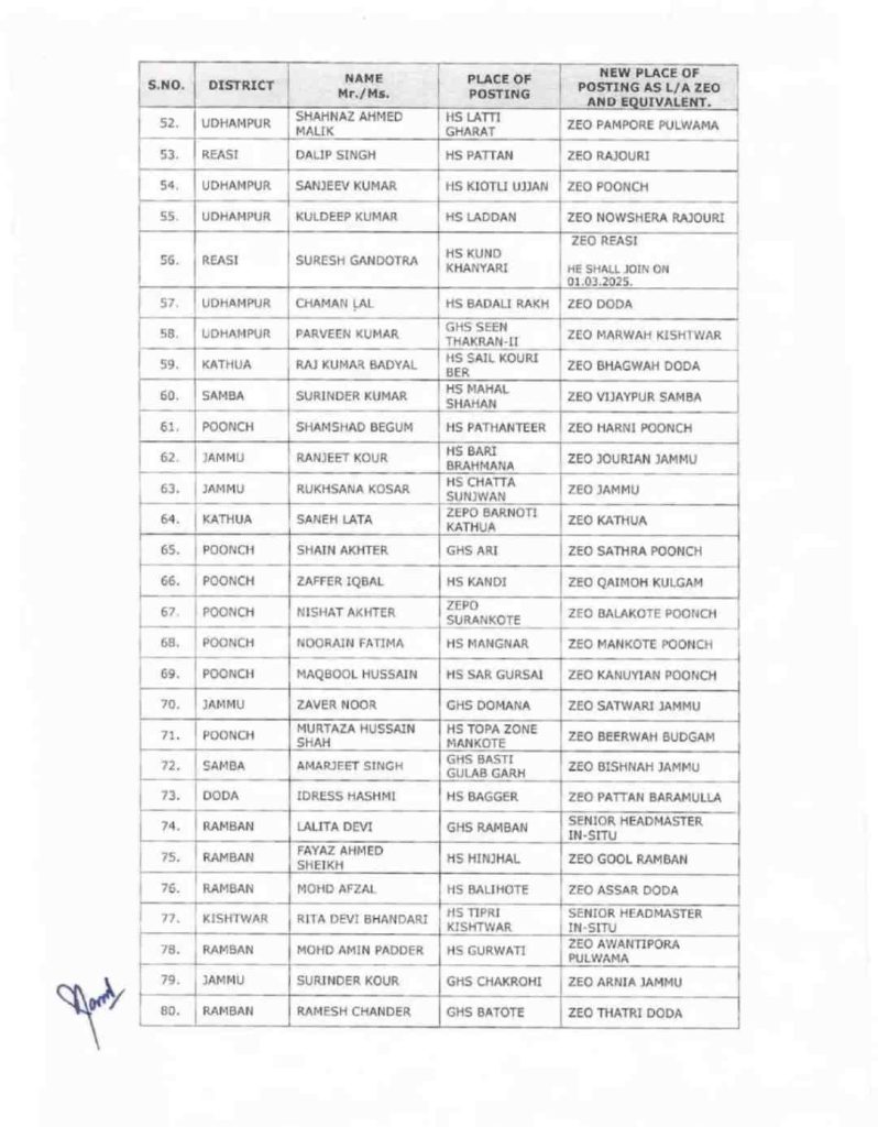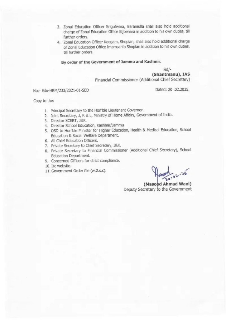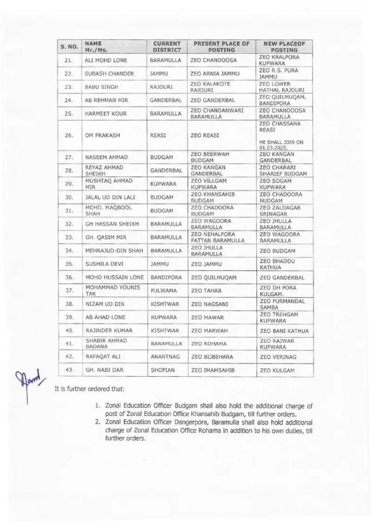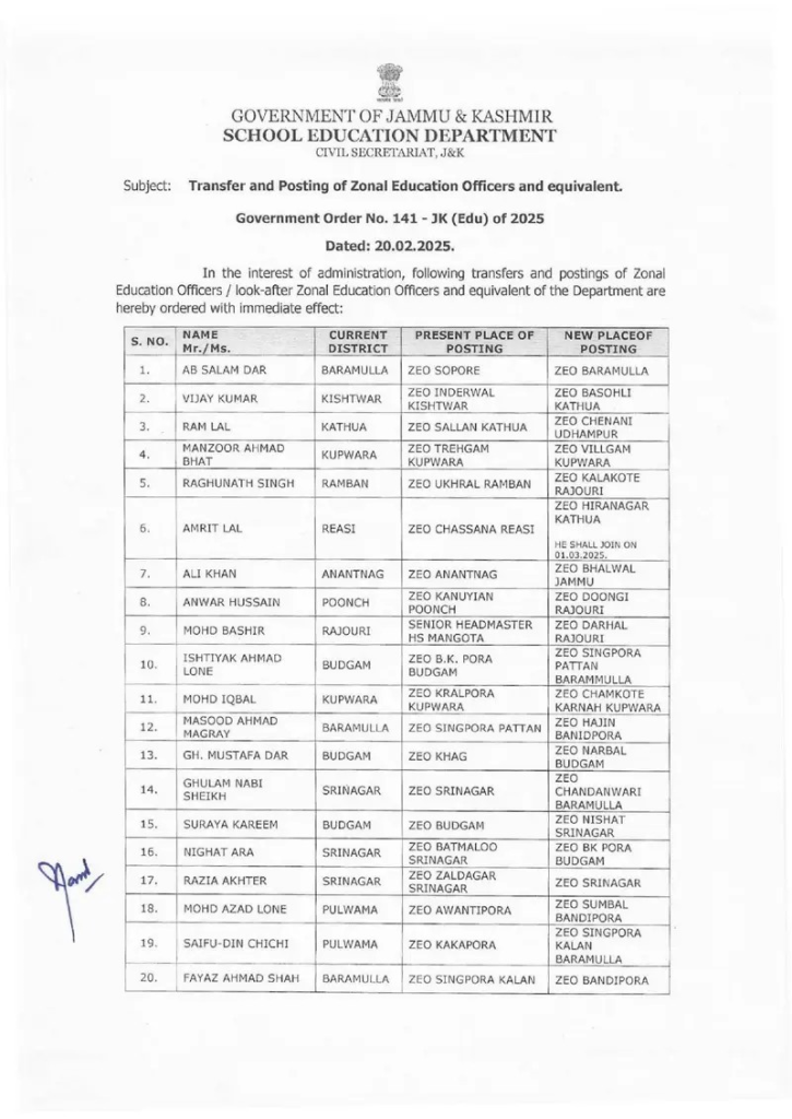 J&K government orders transfers and postings of 123 ZEOs in Education department :Srinagar, February 20, 2025: The Government of Jammu & Kashmir’s School Education Department has issued an official order regarding the transfer and posting of Zonal Education Officers (ZEOs) and equivalent officers across various districts.