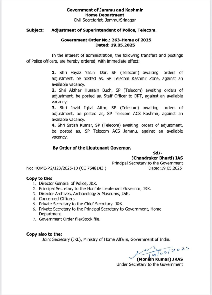 The Government of Jammu and Kashmir’s Home Department has issued a new order (No. 263-Home of 2025) approving the transfer and adjustment of several Superintendent of Police (Telecom) officers in the interest of administrative efficiency.