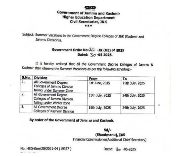 J&K Govt Announces Summer Vacations For Degree Colleges : JAMMU, May 30: The Higher Education Department of the Jammu and Kashmir Government today announced summer vacations for the degree colleges of the UT. Source daily excelsior .