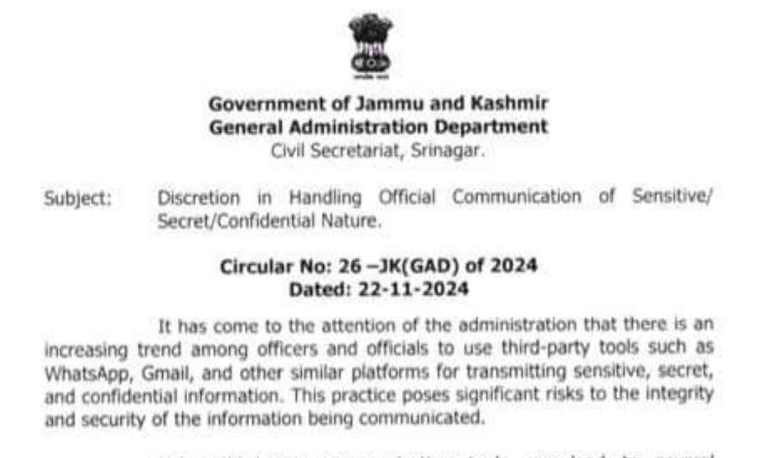 The Jammu and Kashmir government has banned the use of third-party tools like WhatsApp and Gmail for transmission of sensitive official documents, saying it can lead to data breaches and leaks.