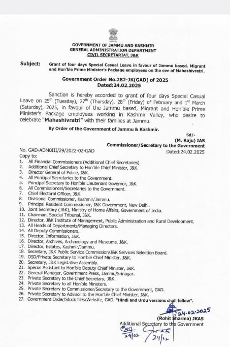 The Jammu and Kashmir Government has approved four days of special casual leave for Jammu-based migrant employees and PM package employees working in various departments across the Kashmir Valley.