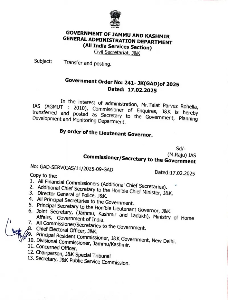 Srinagar, February 17, 2025 – The Government of Jammu and Kashmir has issued a new transfer and posting order for senior bureaucrat Talat Parvez Rohella, an IAS officer from the 2010 batch (AGMUT cadre). Previously serving as the Commissioner of Enquiries, J&K, Rohella has now been transferred and appointed as the Secretary to the Government, Planning Development, and Monitoring Department.