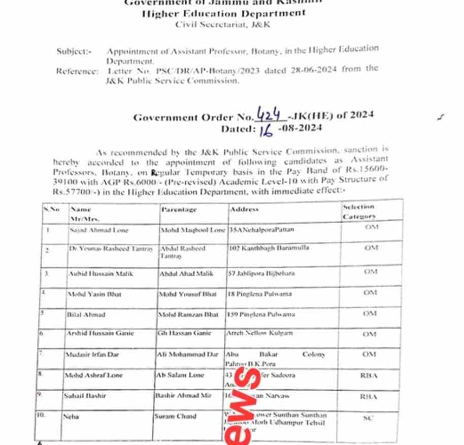 Aug 18: J&K Govt ordered appointment of Assistant Professors, copy.