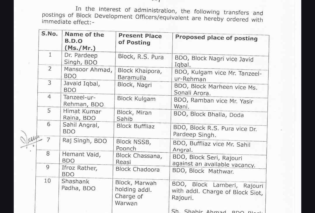 J&K Govt Orders Transfers and Postings of 56 BDOs