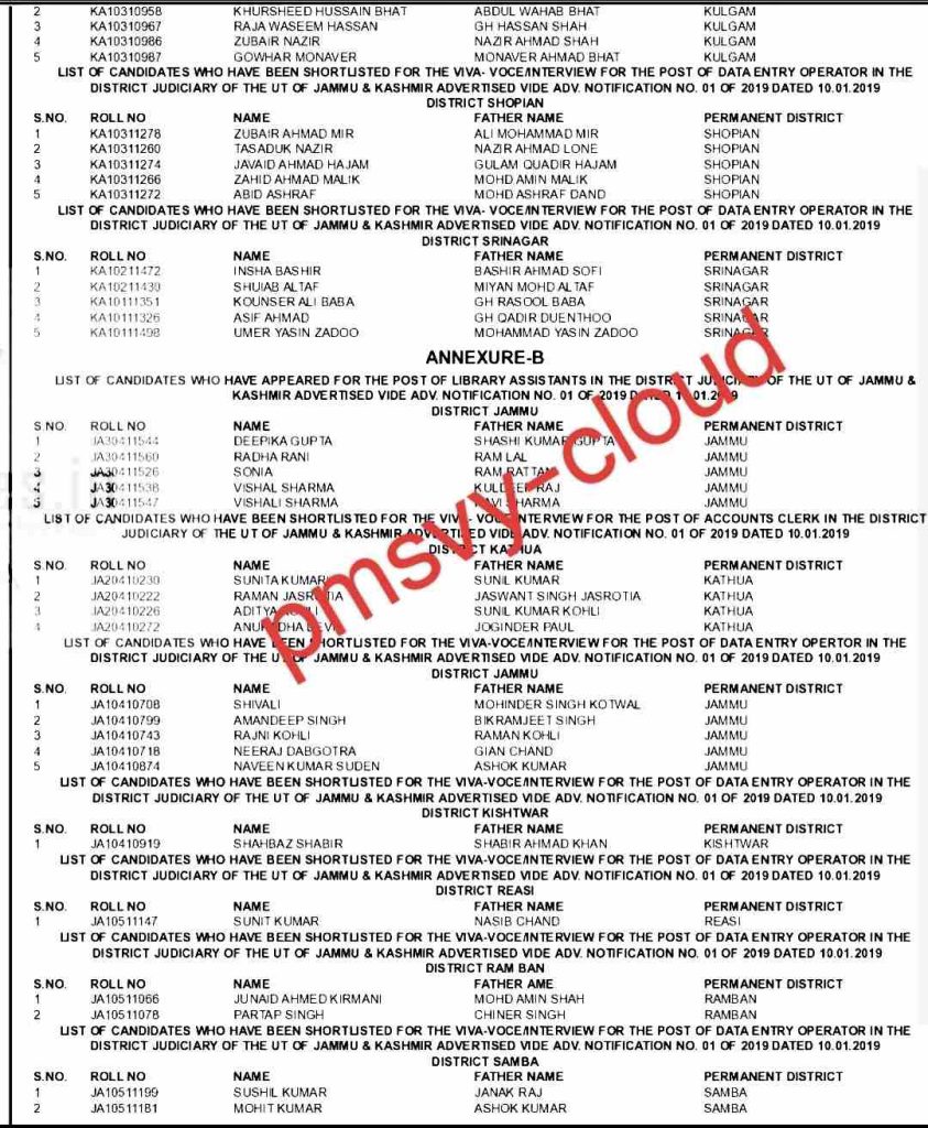 It is for the information of all the candidates who have been shortlisted on the basis of their written test held on 16.03.2024 at Jammu and Srinagar simultaneously as per Annexure- ‘A’ (Kashmir Division candidates) & Annexure- ‘B’ (Jammu Division candidates), that their viva-voce/interview for the post of Accounts Clerks, D.E.O/Computer Operators and Library Assistants in the Subordinate Judiciary of UT of J&K, pursuant to advertisement notification No. 01 of 2019 dated 10.01.2019 is scheduled to be held as per the following schedule: