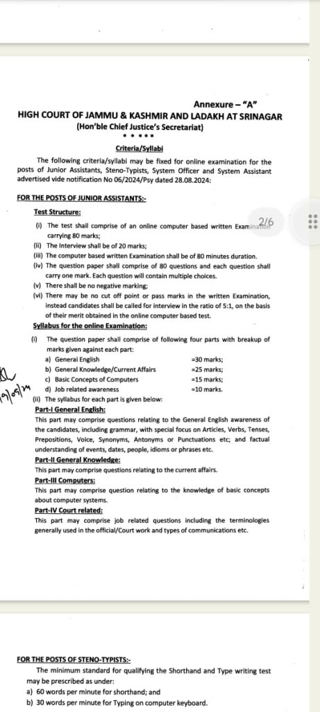 The High Court of Jammu & Kashmir and Ladakh has announced the exam dates for Junior Assistant (Subordinate Judiciary) posts advertised under Notification No. 06 of 2024/Psy dated 28.08.2024. Here’s a detailed guide for candidates, including exam schedules, admit card details, and document verification updates: