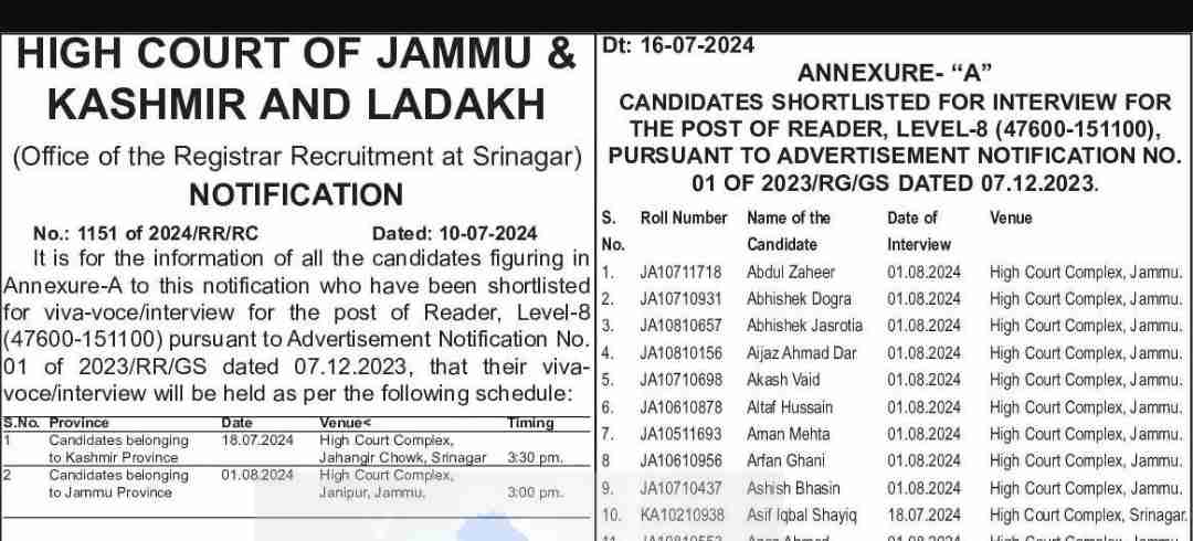 It is for the information of all the candidates figuring in Annexure-A to this notification who have been shortlisted for viva-voce/interview for the post of Reader, Level-8 (47600-151100) pursuant to Advertisement Notification No. 01 of 2023/RR/GS dated 07.12.2023, that their viva-voce/interview will be held as per the following schedule: