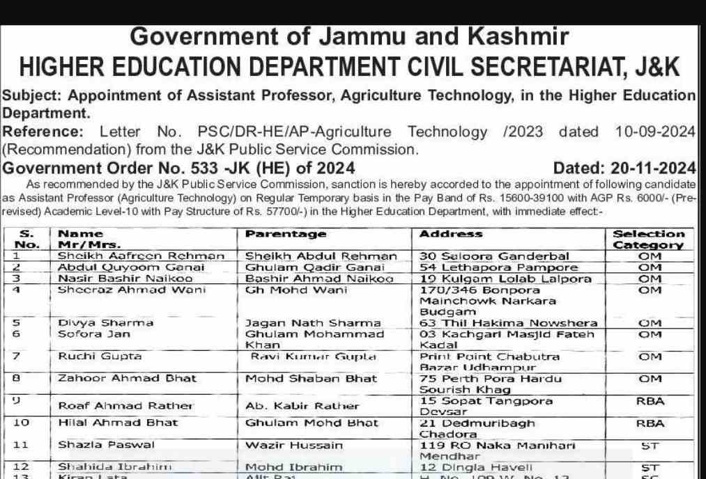 J&K Higher Education: Reference: Letter No. PSC/DR-HE/AP-Agriculture Technology /2023 dated 10-09-2024 (Recommendation) from the J&K Public Service Commission.