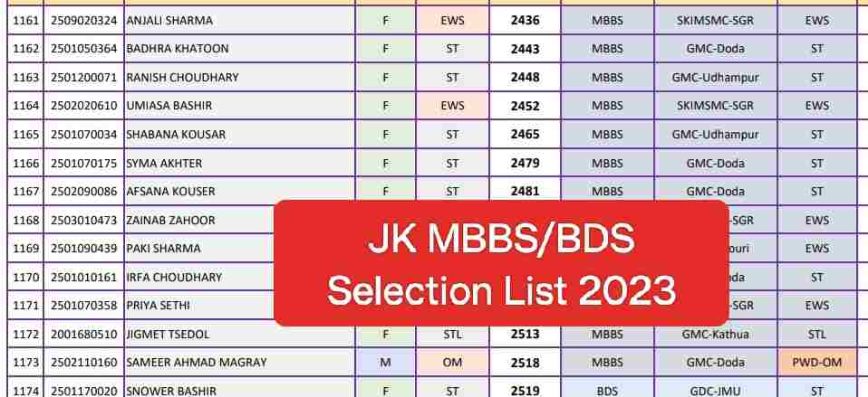 JK MBBS/BDS Selection List 2023 Download Pdf