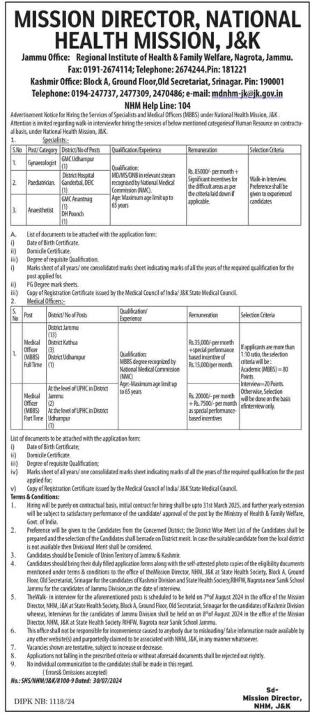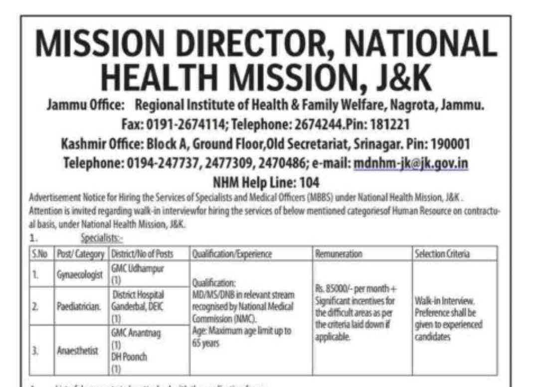 The National Health Mission (NHM), Jammu & Kashmir, has announced walk-in interviews for the recruitment of Specialists and Medical Officers (MBBS) on a contractual basis. The positions are available in various districts across the region.