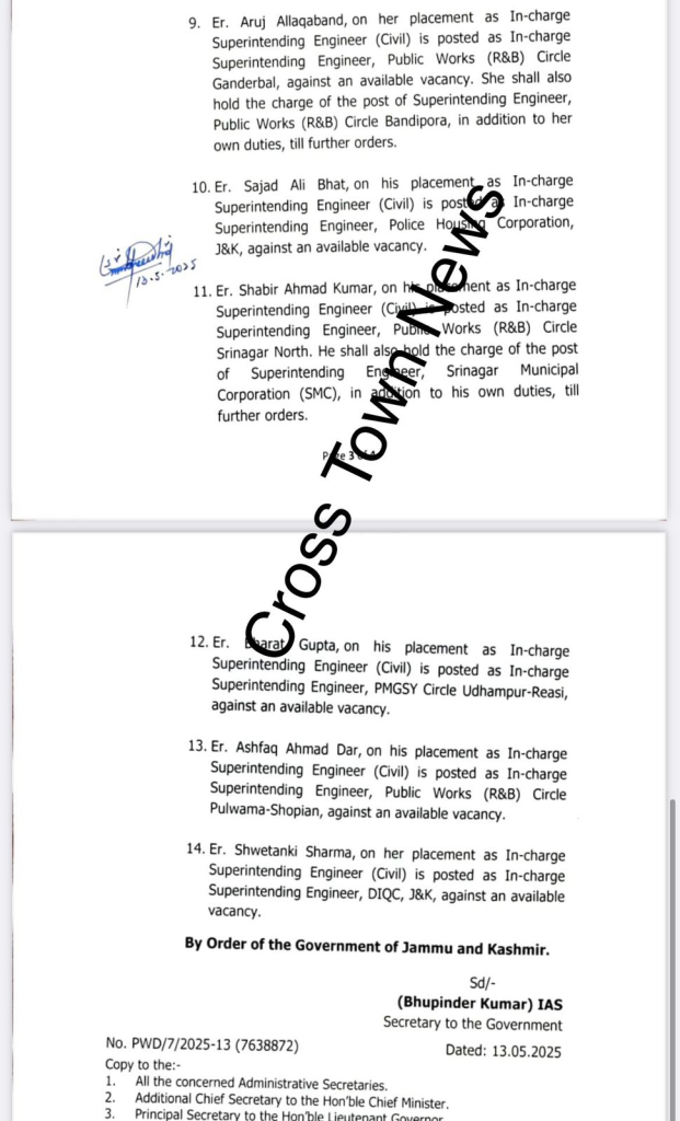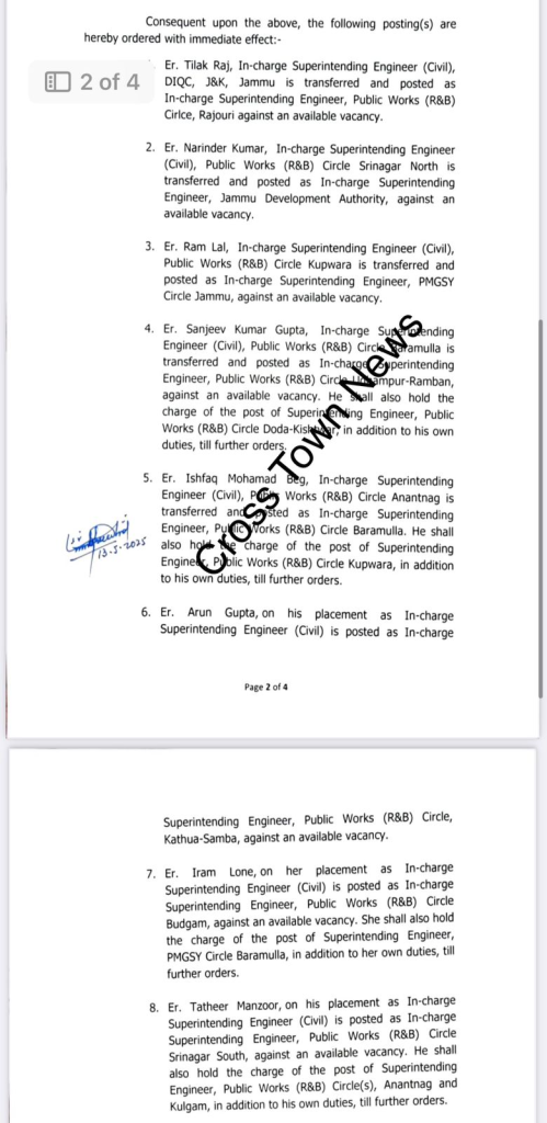 J&K orders transfers and postings of 14 senior Engineers May 14, 2025 by Dar ZahoorMay 14: Deputy Chief Minister J&K Surinder Choudhary , who is also PWD Minister , ordered transfers and postings of 14 Superintending Engineers WhatsApp Group Join Now Leave a Comment Cancel replyCommentName Email Website Save my name, email, and website in this browser for the next time I comment.