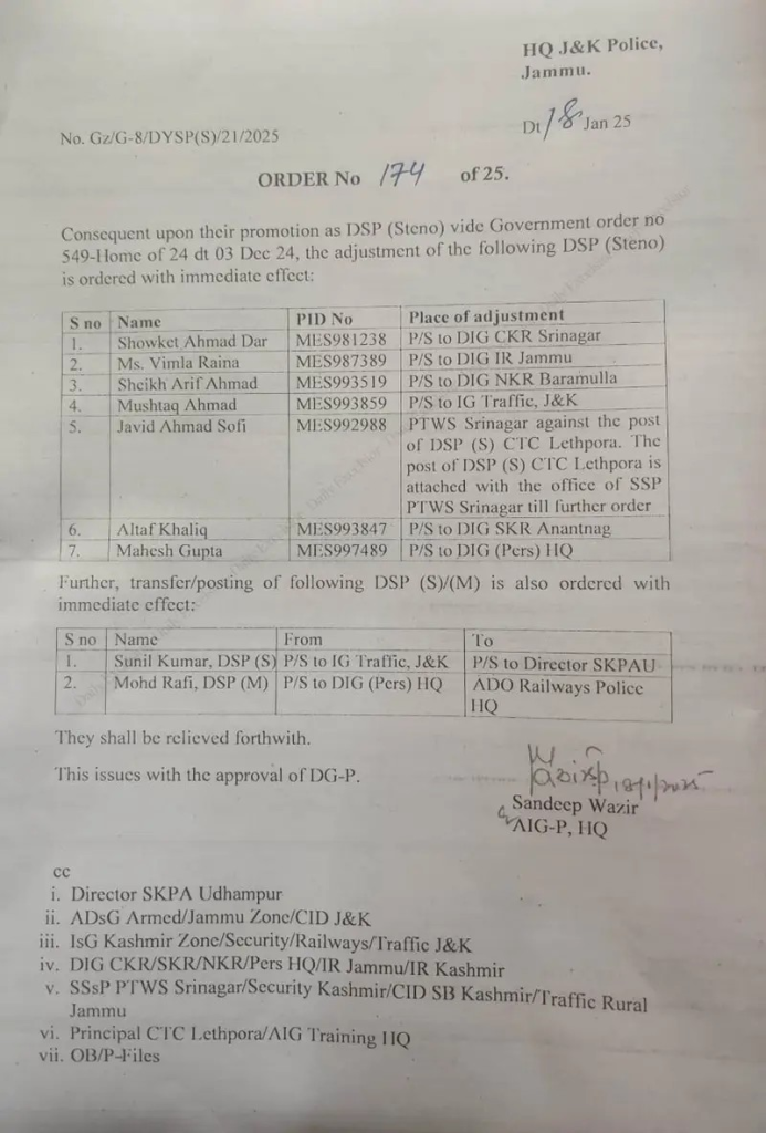 - 5. Javid Ahmad Sofi – Adjusted to PTWS Srinagar against the post of DSP (S) CTC Lethpora. However, this position will remain attached to the SSP PTWS Srinagar until further notice.