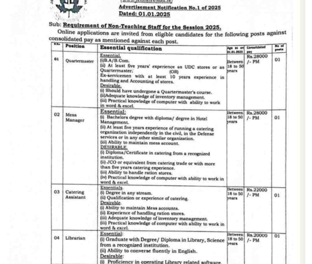 J&K Sainik School Manasbal Recruitment 2025 :J&K Sainik School Manasbal has announced recruitment for various non-teaching staff positions for the academic session 2025. This is a great opportunity to work with a prestigious institution. Below are the details of the vacancies, qualifications, and application process.