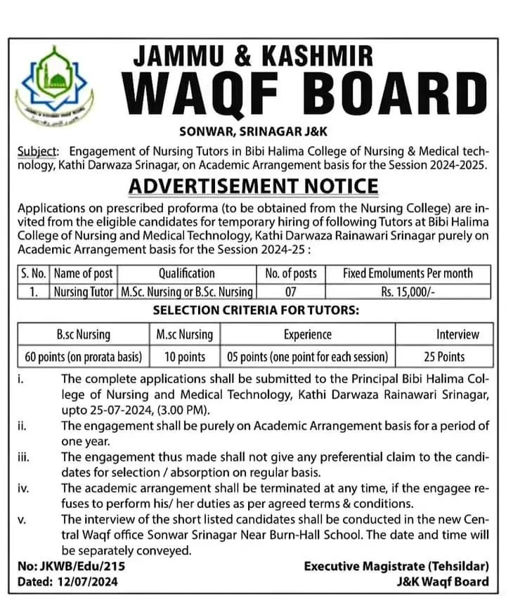 The Bibi Halima College of Nursing and Medical Technology in Srinagar, Jammu & Kashmir, has released an advertisement inviting applications for the engagement of Nursing Tutors on an academic arrangement basis for the session 2024-2025