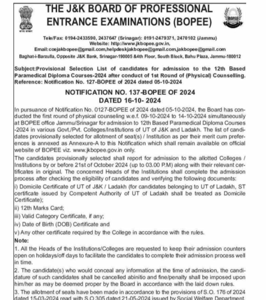 The Jammu and Kashmir Board of Professional Entrance Examinations (JKBOPEE) has released the Provisional Selection List for admission to 12th Based Paramedical Diploma Courses – 2024, following the first round of physical counseling. This process took place from 9th to 14th October 2024, across BOPEE offices in Jammu and Srinagar. The selected candidates have been provisionally allotted seats in various Government and Private colleges/institutions across the Union Territories (UT) of J&K and Ladakh. The full list is available as Annexure-A on the official BOPEE website.