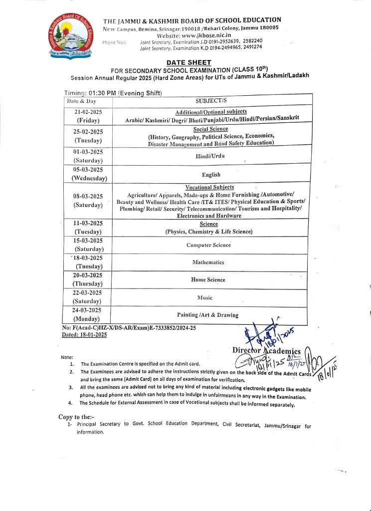 JKBOSE Class 10th Date Sheet Regular 2025 for Hard Zone Areas (Jammu & Kashmir/Ladakh)