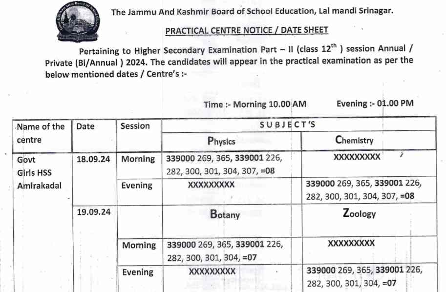 JKBOSE Releases Practical Datesheet for Class 12th Annual (Private)/ Bi-Annual Exam 2024.The Jammu and Kashmir Board of School Education (JKBOSE) has officially released the Practical Centre Notice for the Higher Secondary Examination Part-II (Class 12th) for the Annual/Private (Bi-Annual) 2024 session. This notification applies to students who will be appearing for their practical exams under the bi-annual and private categories.