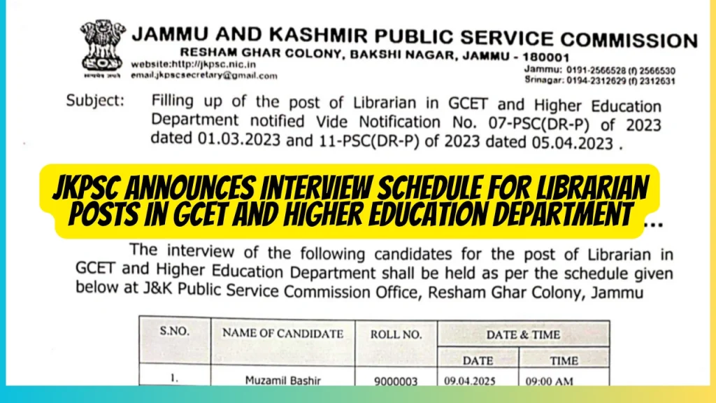 Jammu, April 2, 2025: The Jammu and Kashmir Public Service Commission (JKPSC) has officially announced the interview schedule for the recruitment of Librarians in the Government College of Engineering and Technology (GCET) and the Higher Education Department. This recruitment was initially advertised under Notification No. 07-PSC(DR-P) of 2023, dated 01.03.2023, and Notification No. 11-PSC(DR-P) of 2023, dated 05.04.2023.
