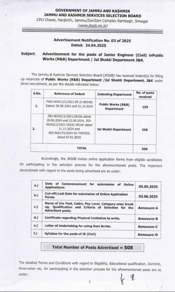 The Jammu & Kashmir Services Selection Board (JKSSB) has officially released Advertisement Notification No. 03 of 2025 dated 24th April 2025, inviting online applications for 508 posts of Junior Engineer (Civil). These vacancies fall under the Public Works (R&B) Department and the Jal Shakti Department in Jammu and Kashmir.