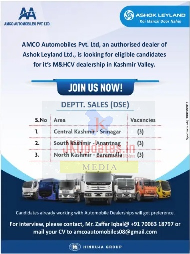 Jobs in AMCO automobiles pvt. Ltd, an authorised dealer of Ashok leyland ltd., is looking for eligible candidates for it’s M&HCV dealership in Kashmir valley.
