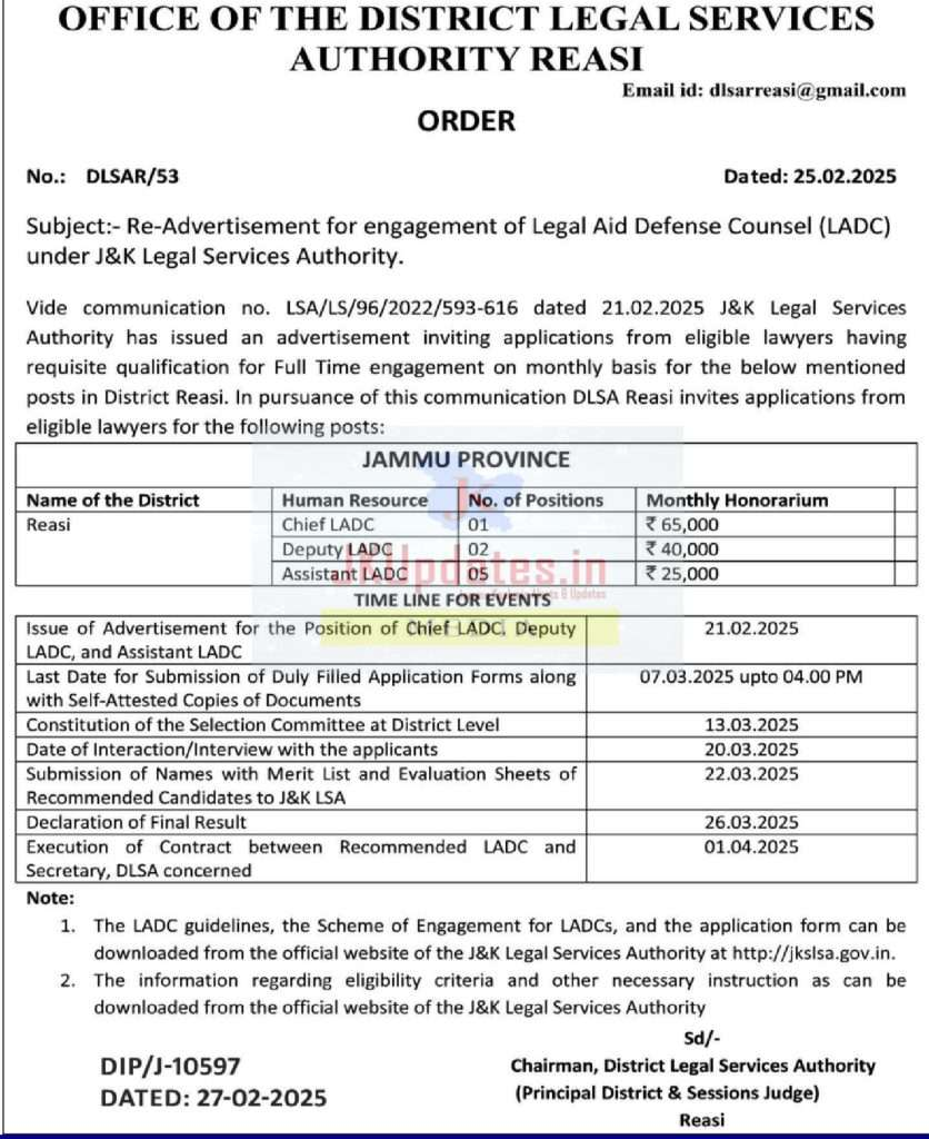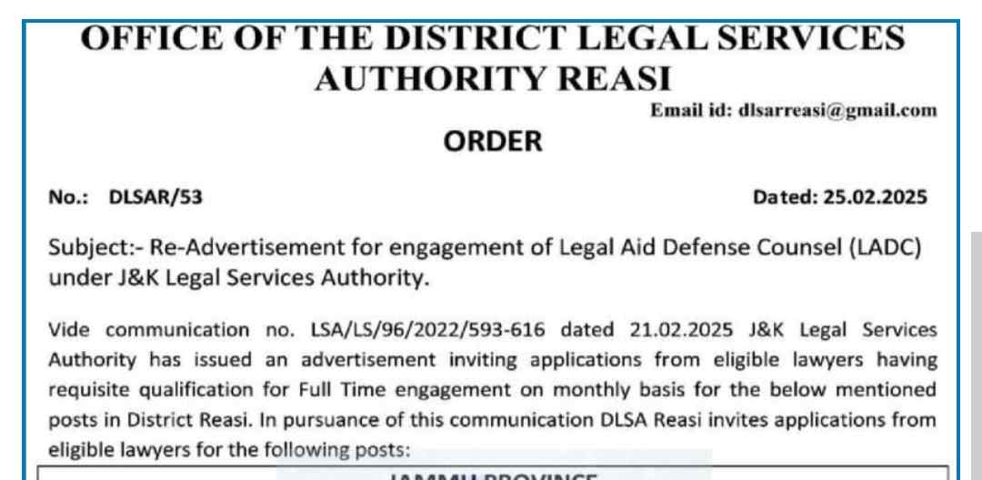 The J&K Legal Services Authority has re-advertised an opportunity for eligible lawyers to apply for full-time engagement under the Legal Aid Defense Counsel (LADC) system in District Reasi. Applications are invited from qualified advocates for the following positions: