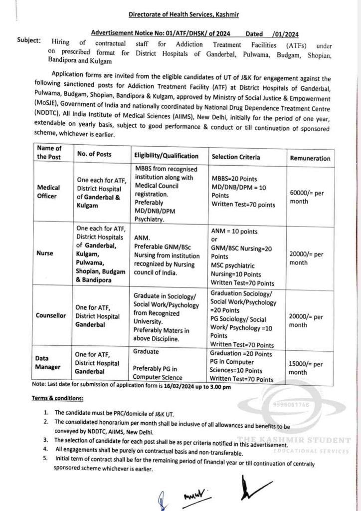 Application forms are invited from the eligible candidates of UT of J&K for engagement against the following sanctioned posts for Addiction Treatment Facility (ATF) at District Hospitals of Ganderbal, Pulwama, Budgam, Shopian, Bandipora & Kulgam, approved by Ministry of Social Justice & Empowerment (MoSJE), Government of India and nationally coordinated by National Drug Dependence Treatment Centre (NDDTC), All India Institute of Medical Sciences (AIIMS), New Delhi, initially for the period of one year, extendable on yearly basis, subject to good performance & conduct or till continuation of sponsored scheme, whichever is earlier.