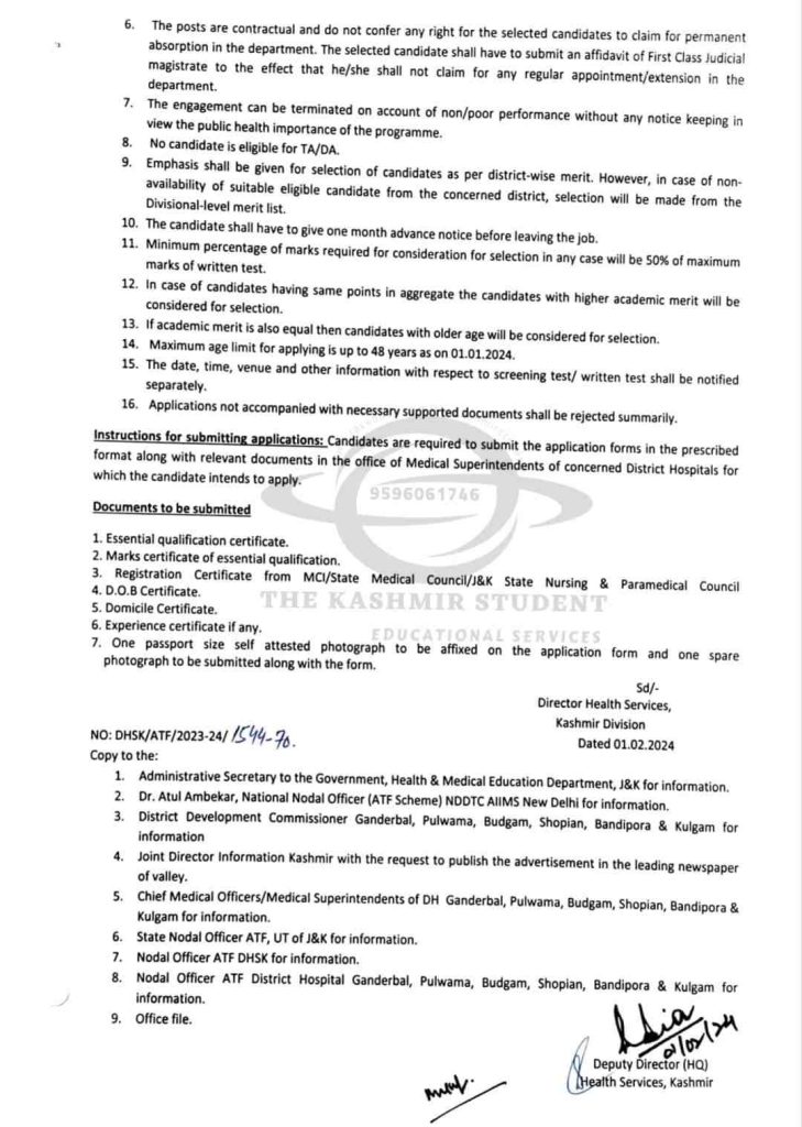 Job Requirements District Hospitals of Ganderbal, Pulwama, Budgam, Shopian. Advertisement Notice No: 01/ATF/DHSK/ of 2024 Dated /01/2024