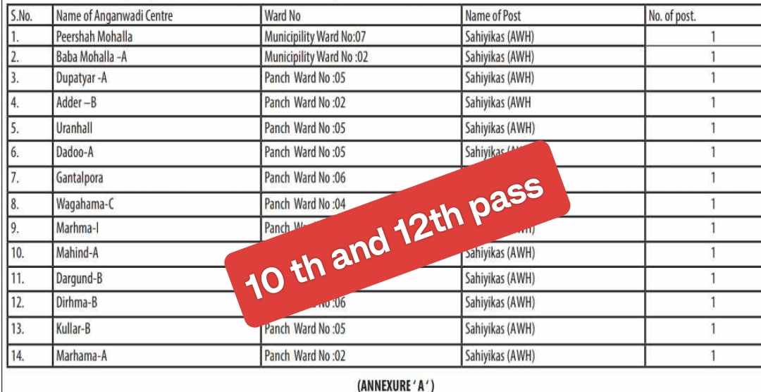 Job Vacancies Anganwadi Workers In Various Centres jk – The Government of Jammu and Kashmir has announced recruitment for Anganwadi Workers (Sahiyaiks) through the Office of the Child Development Project Officer, Poshan, Bijbehara. This re-advertisement notice (No. 05 of 2024) dated July 5, 2024, invites applications for positions in various Anganwadi Centres under the Poshan Project Bijbehara. It follows earlier notices dated November 30, 2022, April 28, 2023, and January 21, 2024.