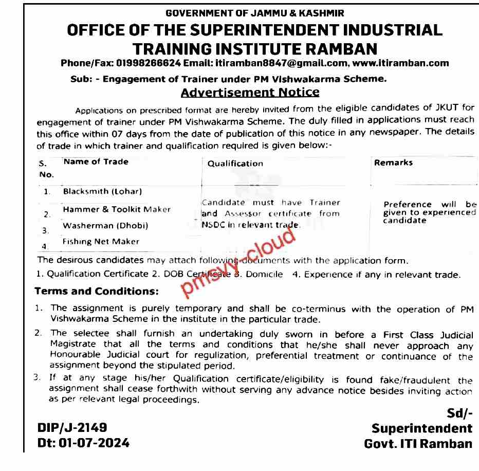 Applications on prescribed format are hereby invited from the eligible candidates of JKUT for engagement of trainer under PM Vishwakarma Scheme. The duly filled in applications must reach this office within 07 days from the date of publication of this notice in any newspaper.