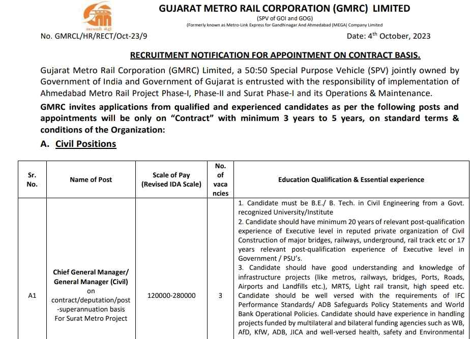 Job Vacancy at Gujarat Metro Rail Corporation Limited (GMRCL’Overview of Recruitment