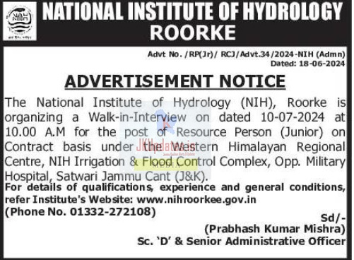 The national institute of hydrology (NIH), Roorke is organizing a Walk-in-interview on dated 10-07-2024 at 10.00 A.M for the post of Resource Person (Junior) on contract basis under the western Himalayan regional Centre, NIH irrigation & flood control complex, opp. Military hospital, Satwari jammu cant (J&K).