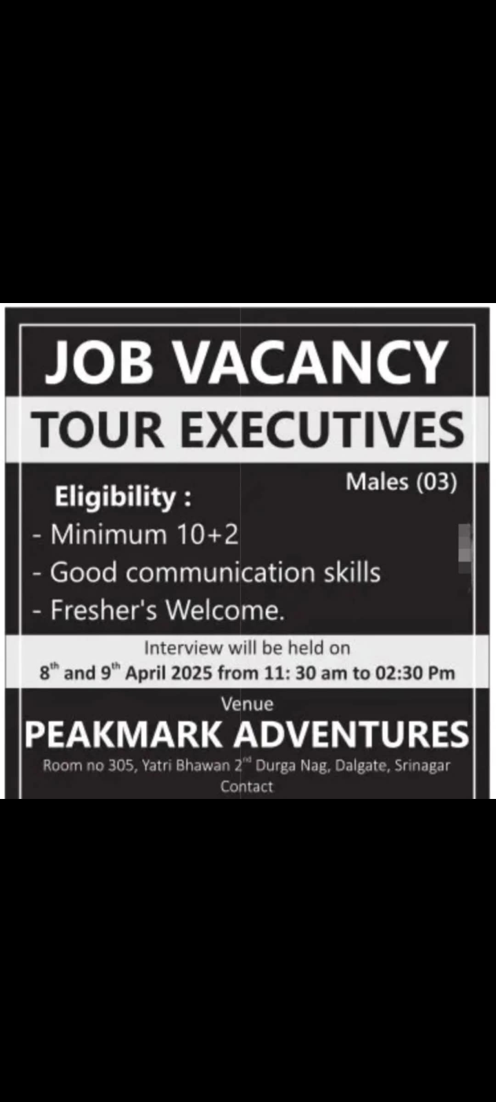 Join the Adventure:Are you someone who loves exploring new places and meeting new people? Here’s your chance to turn your passion into a profession! Peakmark Adventures is looking for three enthusiastic Male Tour Executives to join their vibrant team.