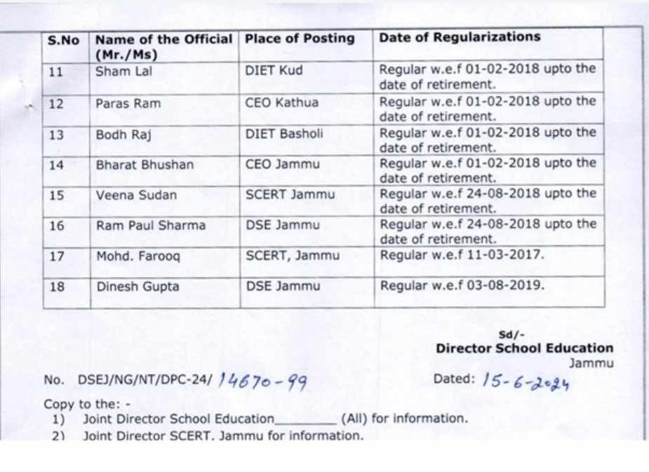 June 16: J&K Govt ordered regularizations as 18 Section Officers, order