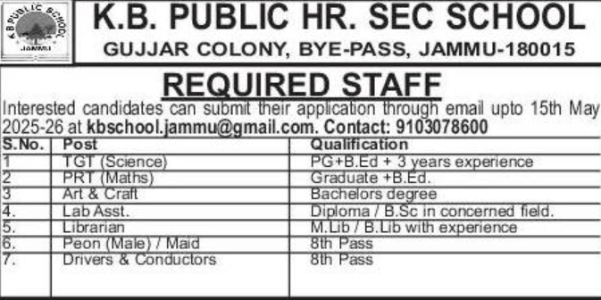 Eligible candidates should send their applications via email to kbschool.jammu@gmail.com by 15th May 2025.