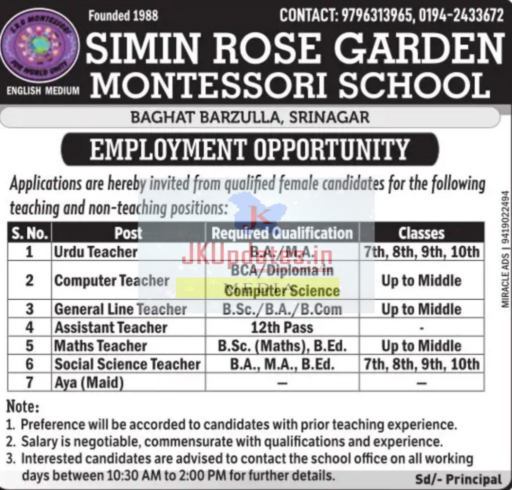 Kashmir Jobs: Teaching & Non-Teaching Vacancies at Simin Rose Garden Montessori School