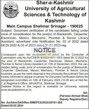 Consequent upon the declaration of result by the Controller of Examination vide No.Au/COE/R-5/2023/1971-1975 dated 09.12.2023 for the post of Blacksmith, Carpenter, Electrician, Mason, Mechanic, Plumber & Senior Library Assistant on 11th of December, 2023, the candidates falling under zone of consideration for the post(s) of Blacksmith, Carpenter, Electrician, Mason, Mechanic, Plumber & Senior Library Assistant, as per the merit obtained in the University Recruitment Test are hereby informed to appear in-person for Document Verification before the designated committee on 12th of February, 2024 (10.00 am) at Hall No. 1 at Registrar’s Office, SKUAST-K, Shalimar, Srinagar.