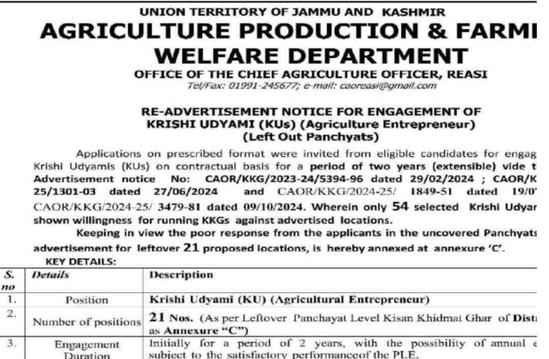 Krishi Udyami (Agriculture Entrepreneur) Recruitment in District Reasi – The Agriculture Production Department, Jammu & Kashmir, is inviting applications for the engagement of Krishi Udyami (KUs) or Agriculture Entrepreneurs in District Reasi. This re-advertisement aims to fill 21 vacant positions on a contractual basis, initially for two years (extendable), to promote agricultural innovation and entrepreneurship within the community.