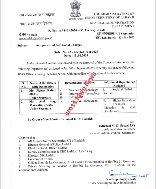 The Ladakh Administration has assigned additional responsibilities to two JKAS officers. According to information available with Cross Town News, Jigmet Raftan, currently serving as Under Secretary, will oversee the Social and Tribal Welfare Department. Meanwhile, Atul Singh Mankotia, also an Under Secretary, has been tasked with managing Higher Education, Technical Education, and Skill Development. These assignments will remain in effect until further notice.