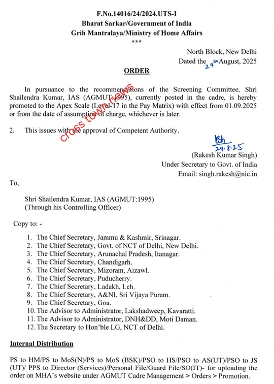August 29:IAS Officer of J&K-AGMUT Cadre, Shailendra Kumar, who is known for his quick disposals & actions has been promoted to  Apex Scale(Level-17) by Ministry of Hom Affairs.