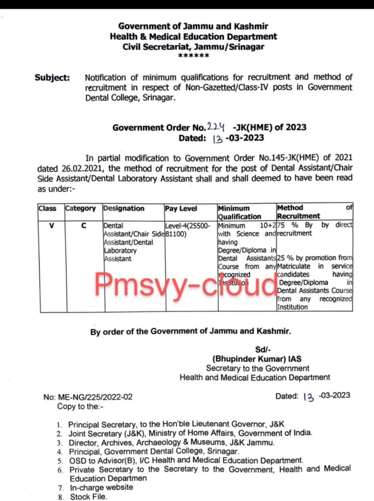 The Government of Jammu and Kashmir has issued a modification to the Government Order No. 145-JK(HME) of 2021, which pertains to the minimum qualifications and method of recruitment for non-gazetted/class-IV posts in Government Dental College, Srinagar. The modification is detailed in Government Order No. 224-JK(HME) of 2023, dated March 13, 2023.