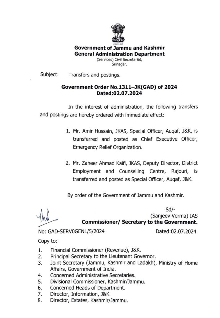 Jammu and Kashmir government orders transfer and posting of JKAS Officers.