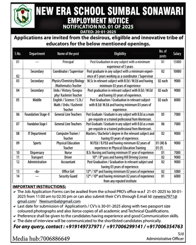 Application Process: Candidates can collect the application forms from the school office between 21-01-2025 and 30-01-2025, from 11:00 AM to 2:30 PM. Alternatively, applicants can submit their CVs via email: newera7971@gmail.com.