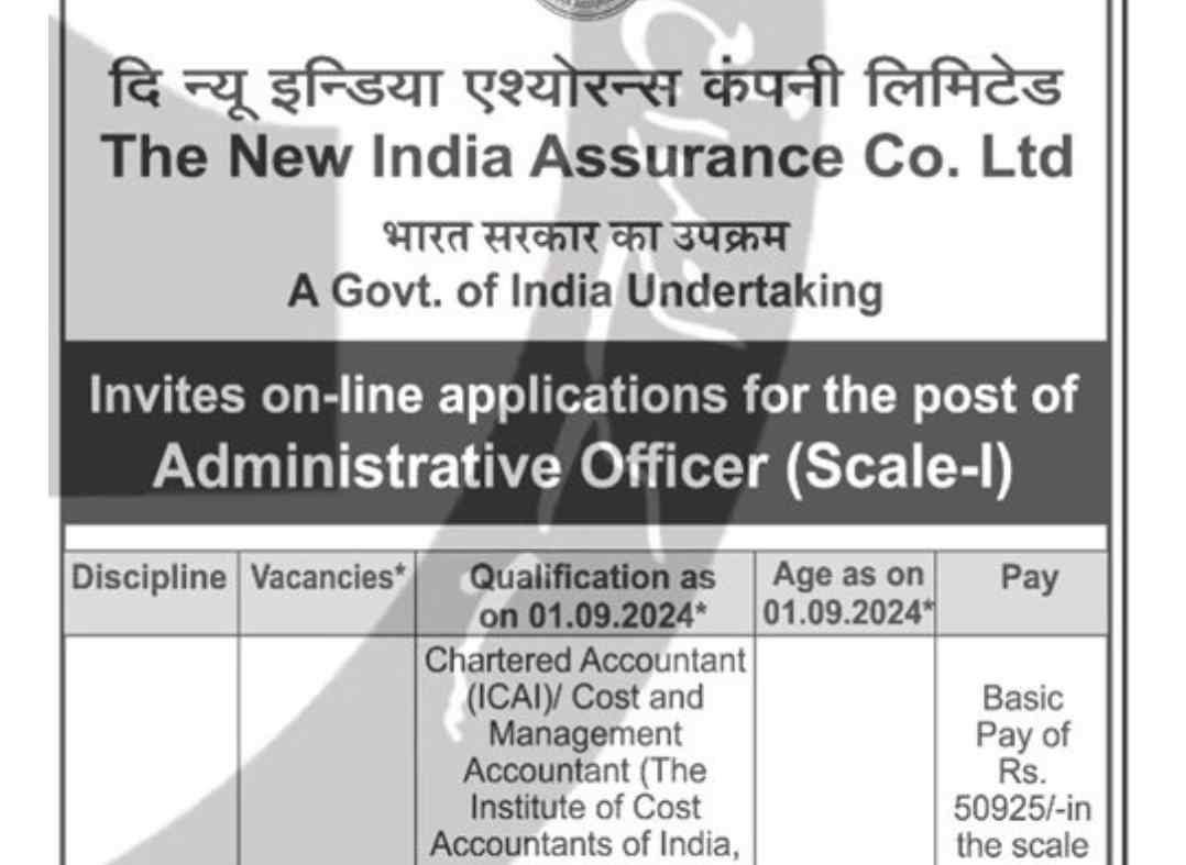 New India Assurance Co. Ltd Administrative Officers Recruitment 2024: The New India Assurance Co. Ltd. (NIACL), one of the leading public sector general insurance companies, has announced its Administrative Officers (Scale-I) Recruitment 2024. This recruitment drive invites applications for 170 Administrative Officer posts in various disciplines, including Accounts and Generalist roles. Candidates who meet the required qualifications and are looking for a stable and rewarding career in the insurance sector are encouraged to apply online within the specified time frame.
