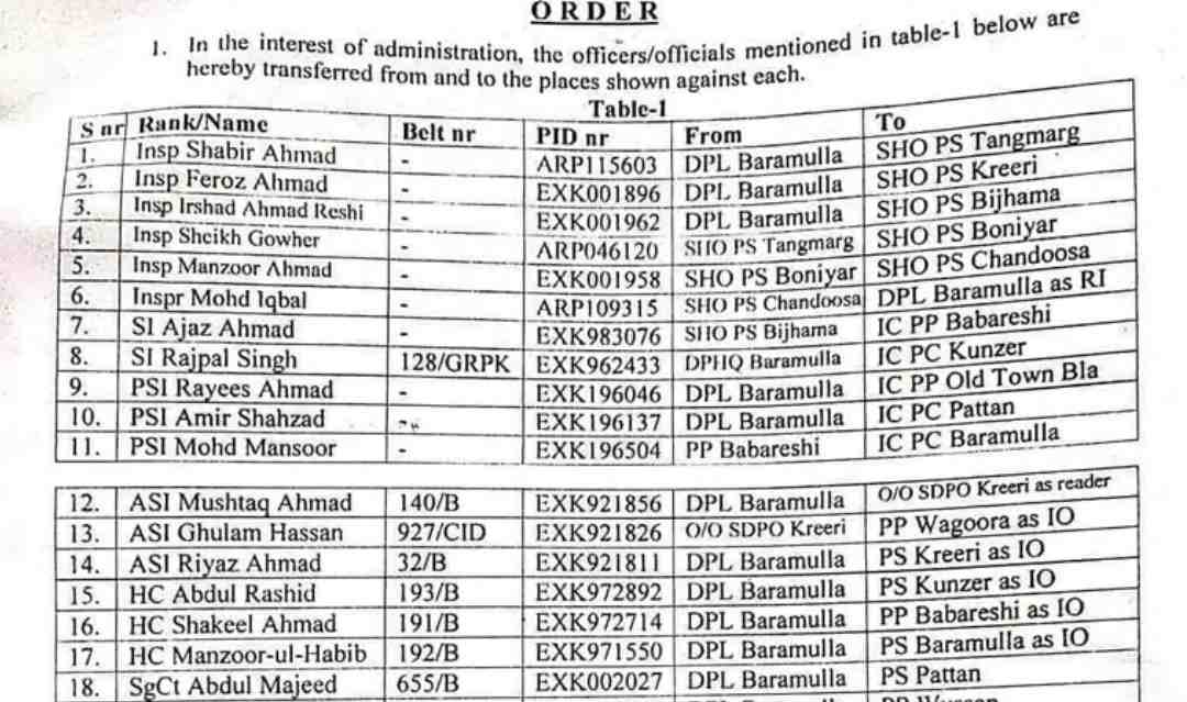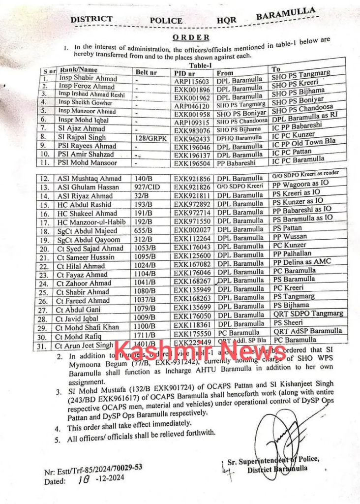 In a significant administrative reshuffle, the District Police Headquarters Baramulla has issued transfer orders for several officers to ensure efficient functioning. The changes are aimed at optimizing operational effectiveness across the district.
