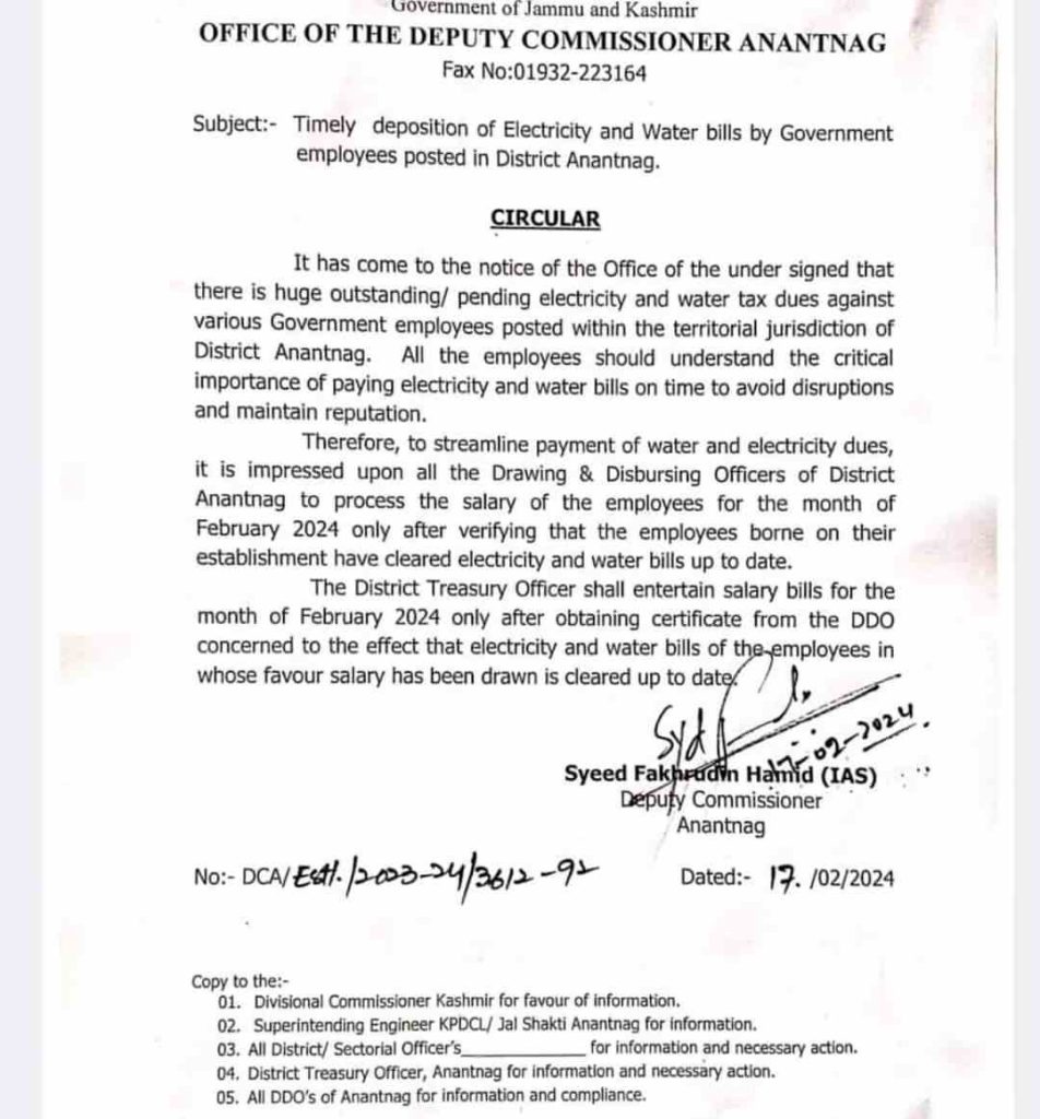 Therefore, to streamline payment of water and electricity dues, it is impressed upon all the Drawing & Disbursing Officers of District Anantnag to process the salary of the employees for the month of February 2024 only after verifying that the employees borne on their establishment have cleared electricity and water bills up to date.