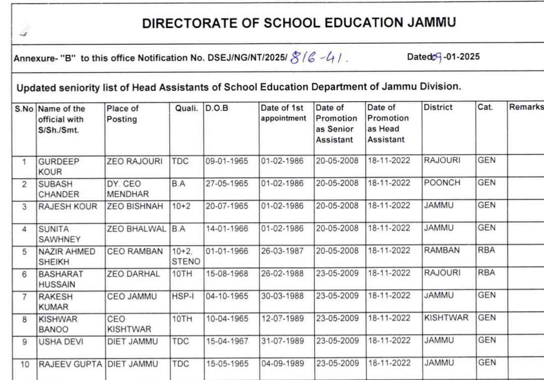 The Directorate of School Education, Jammu, has issued the updated seniority lists for Section Officers, Head Assistants, Senior Assistants, and Chauffeurs/Drivers.